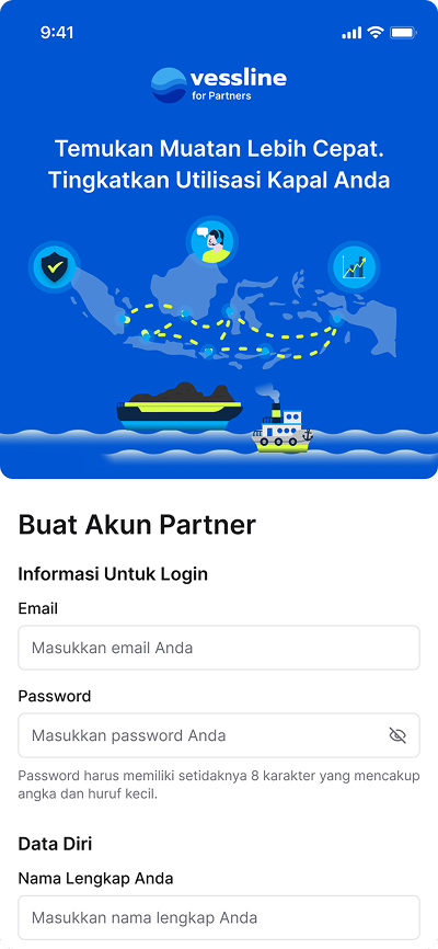 Daftarkan perusahaan Anda untuk mulai mencari dan mengambil shipping order. Alur pendaftaran kami dirancang untuk menjamin keamanan dan kepercayaan bagi semua pihak, baik pemilik kapal maupun pengirim.