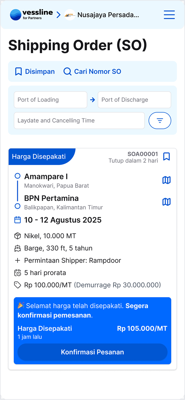 Tingkatkan utilisasi kapal dengan SO sesuai rute Anda, negosiasi cepat dan aman, didukung keahlian tim operasional terpercaya.
