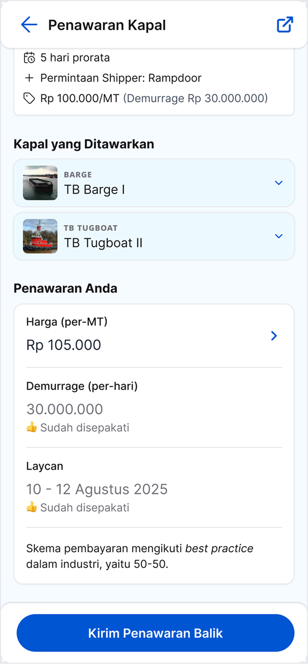 Tawarkan kapal Anda untuk shipping order yang tersedia dan negosiasikan harga serta ketentuan pengiriman yang sesuai. Platform kami memudahkan proses negosiasi sehingga Anda dan pengirim dapat mencapai kesepakatan yang saling menguntungkan dengan cepat.